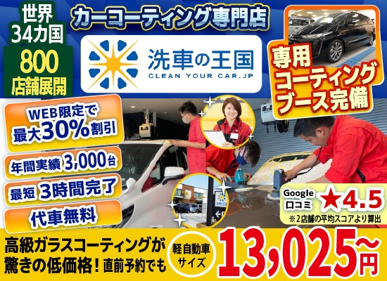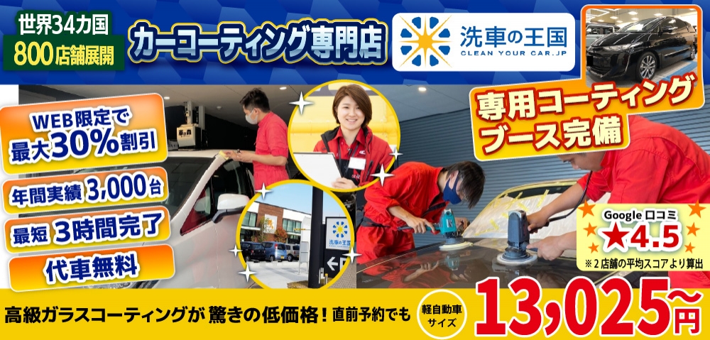洗車の王国泉大津店・なかもず店は、堺市北区・泉大津・大阪狭山・富田林・河内長野・大阪市住之江区・住吉区・岸和田・忠岡町・泉北郡エリアのカーコーティング・手洗い洗車専門店として、日本有数のカーコーティングブランド、洗車の王国クリスタルグローの施工技術認定店として認定を受けております!