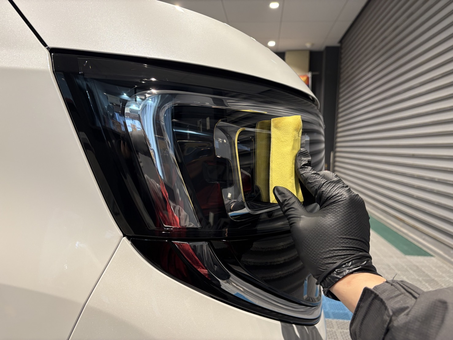 メニューに含まれているヘッドライトコーティングから追加料金を頂き、飛び石や紫外線予防に最適なプロテクションフィルムを施工いたしました。