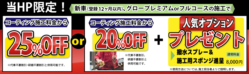 | 工程 | 5年ガラスコーティング(手洗い洗車+フェンダ内清掃+水垢除去+虫・ピッチ除去+エアブロー+タイヤ洗浄+タイヤワックス+ホイール洗浄)、鉄粉除去、鏡面研磨、全面窓ガラスコーティング、ホイールコーティング、樹脂パーツコーティング、ヘッドライトコーティング、メッキパーツコーティング、エンジンルーム洗浄 |