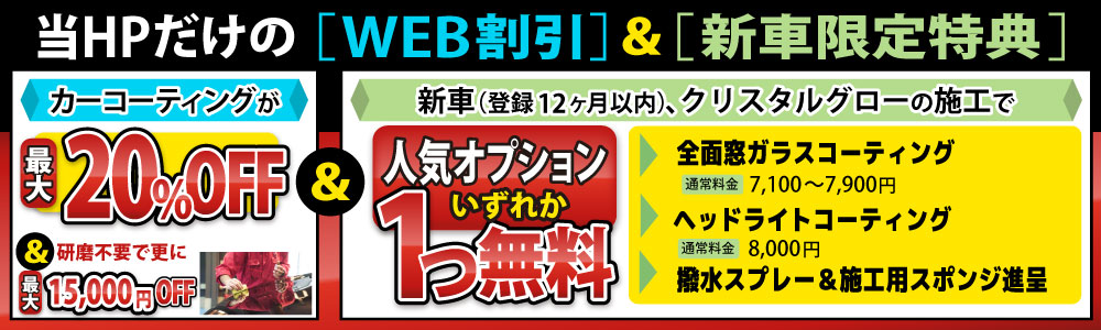 | 特徴 | 3年間効果が持続します。 クリスタルグローバリューの工程に加え、鉄粉除去と軽研磨を行う為、新車並みの光沢感が蘇ります。 耐久型コート剤の中でも頂点といわれるコート剤の成分を使用している耐久性に優れた高硬度のガラスコーティングです。無機質のガラス皮膜を形成する為、防汚効果・光沢性はもちろんの事、高い撥水性能を発揮します。ボディに汚れが付いた場合にも簡単に落とす事が可能です。 |